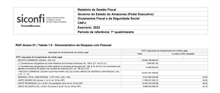 Relatórios de Gestão Fiscal do Governo do Amazonas, disponíveis no site do Tesouro Nacional, apontam que o Executivo gastou, no primeiro quadrimestre de 2022, R$ 9,46 bilhões com o pagamento de pessoal, o equivalente a 47,06% de receita corrente líquida ajustada, que totalizou R$ 20,10 bilhões. No mesmo período deste ano, os gastos foram reduzidos para R$ 9,24 bilhões, cerca de 40,82% da receita corrente líquida ajustada, que somou, no período, R$ 22,65 bilhões.