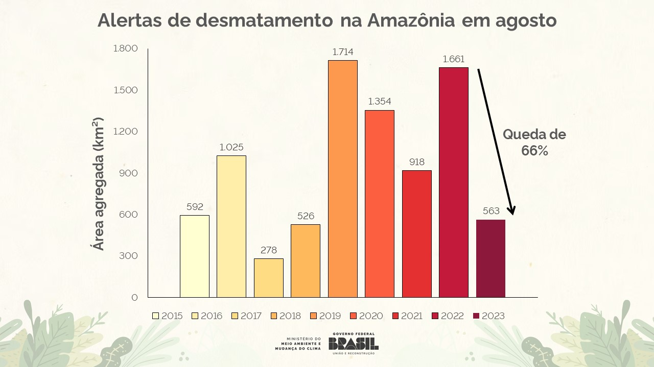 área sob alertas de desmatamento na Amazônia caiu 66% em agosto na comparação com o mesmo mês de 2022, segundo dados do sistema Deter-B, do Inpe Instituto Nacional de Pesquisas Espaciais). De janeiro a agosto, a redução foi de 48% em relação ao mesmo período do ano anterior.