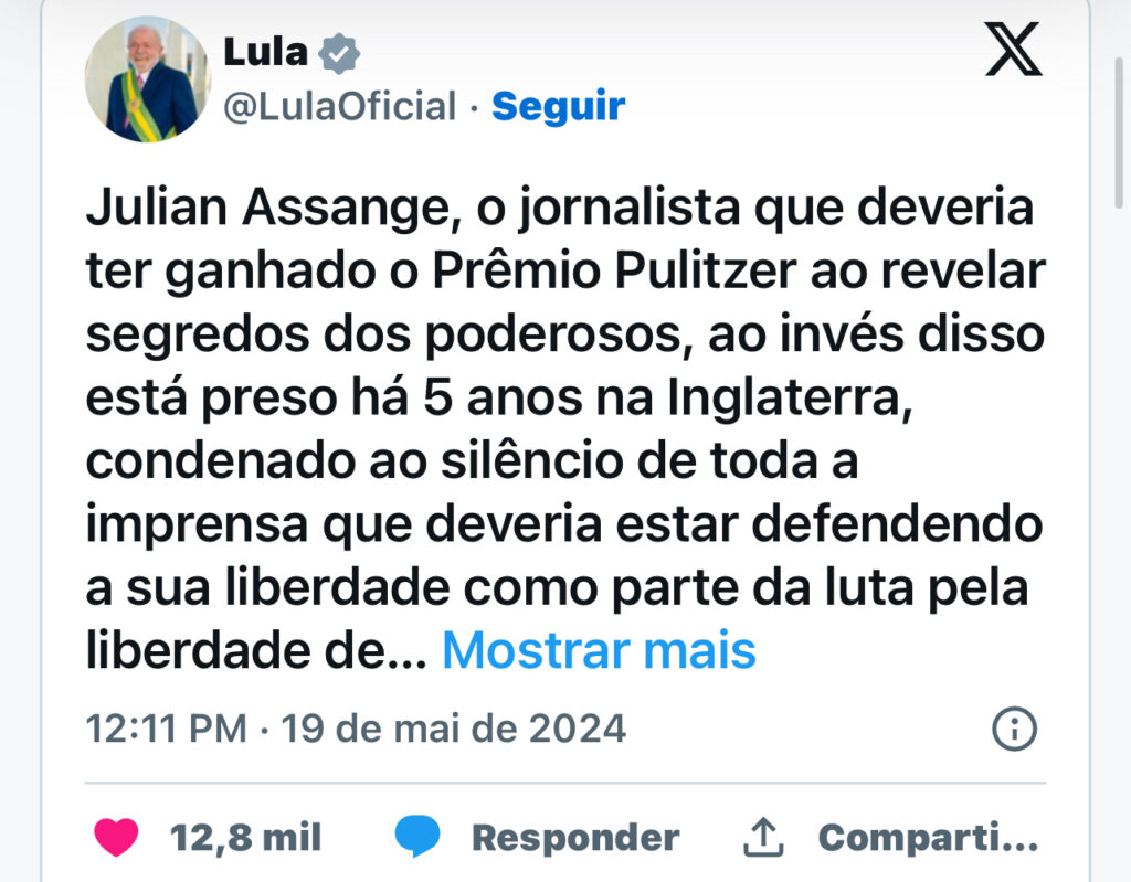 Lula afirmou que o jornalista deveria ter sido premiado por revelar “segredos dos poderosos” ao invés de estar preso: “espero que a perseguição contra Assange termine e ele volte a ter a liberdade que merece o mais rápido possível.”