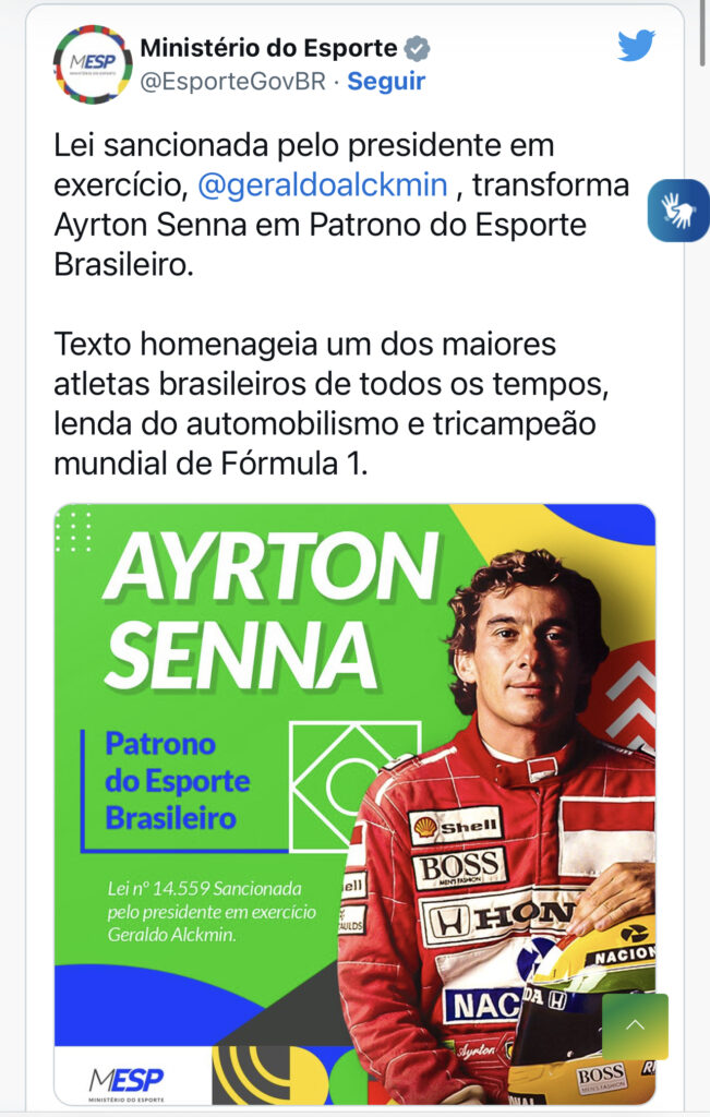 O tricampeão mundial de Fórmula 1 Ayrton Senna da Silva foi declarado Patrono do Esporte Brasileiro através da Lei 14.559/2023, sancionada pelo vice-presidente e presidente em exercício, Geraldo Alckmin. A informação foi publicada na edição desta quarta-feira (26) do Diário Oficial da União.