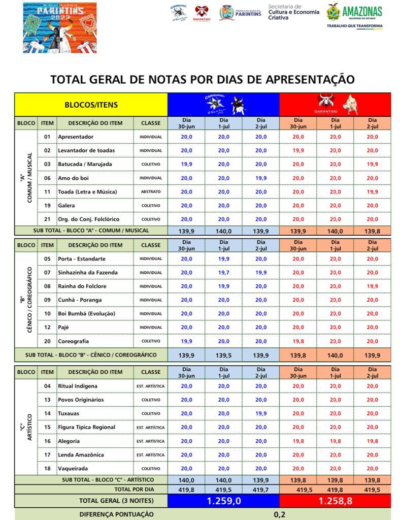 O Caprichoso venceu as três noites do festival. Na primeira noite (30/06), Caprichoso pontuou 419,8 contra 419,5 do Garantido. Na segunda noite (01/07), Caprichoso alcançou 419,5 pontos e o Garantido, 419,8. Na terceira e última noite (02/07), o Caprichoso venceu com 419,7 contra 419,5 pontos e, assim, consagrou-se bicampeão do 56º Festival Folclórico de Parintins.