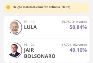 Lula vira na reta final e é eleito presidente do Brasil com 1,66 ponto percentual de vantagem 30 de outubro de 2022