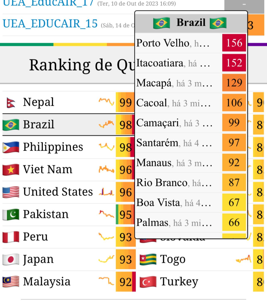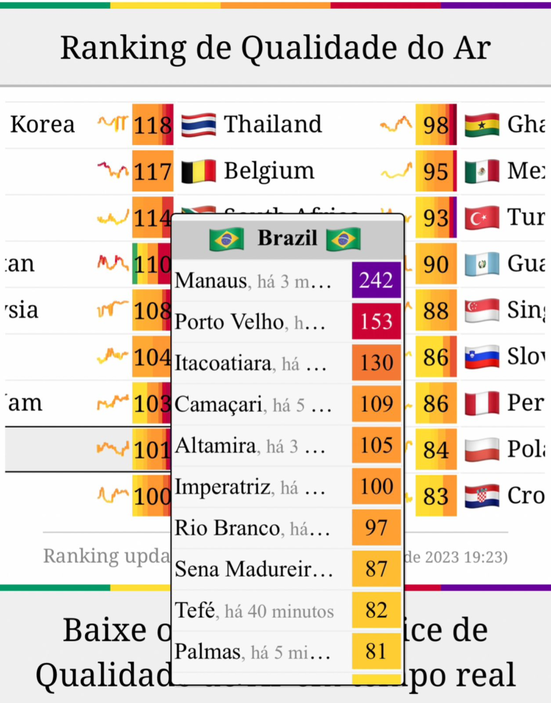 Na última quinta-feira, Manaus registrou um índice de qualidade do ar (AQI, na sigla em inglês) de 500, uma das maiores do mundo e a maior do País. Hoje, a cidade aparece em sétimo no ranking brasileiro. Em primeiro, está Porto Velho (RO) e, em segundo, Itacoatiara (AM).