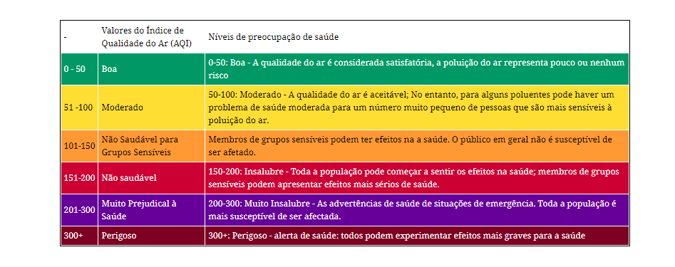 A aqinc.org trabalha com cinco classificações para a qualidade do ar, que vão de a-50 – para boa – a 300, considerado perigosa. Os números são classificados por cores. Quanto mais escura a cor, maiores são os riscos.