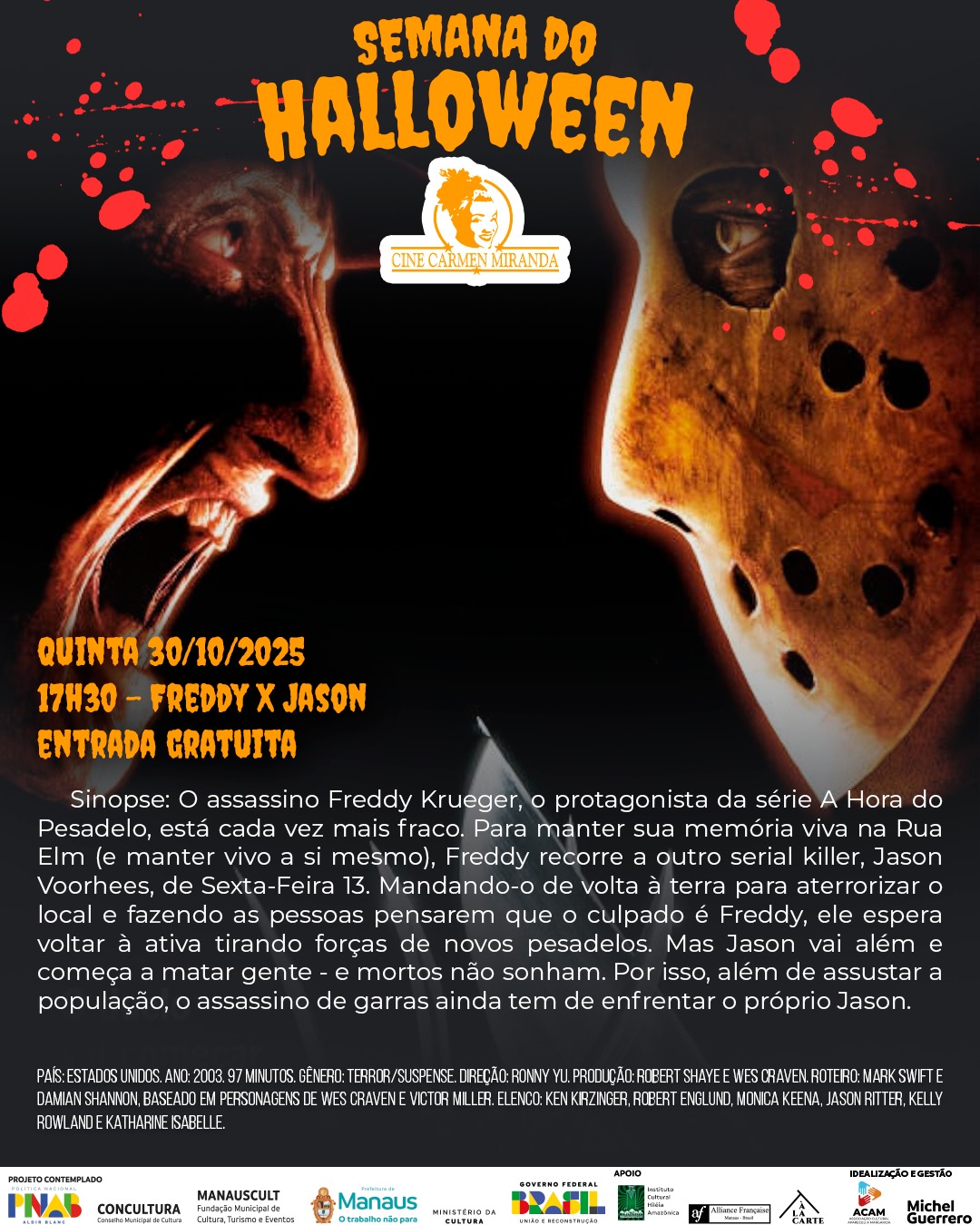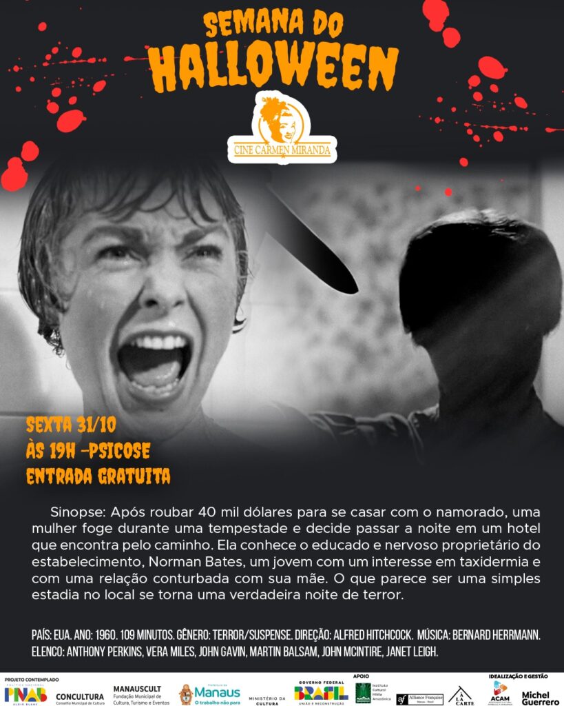 O Cine Carmen Miranda, na rua do Congresso, Centro de Manaus, realiza uma programação especial com o ciclo ‘Semana do Halloween’, de quinta-feira a sábado (30.10 a 01.11), com seis filmes de suspense e terror estrelados ou dirigidos por Alfred Hitchcock, Dario Argento, Wes Craven, Robert Englund, Drew Barrymore e Klaus Kinski. O acesso é inteiramente gratuito.