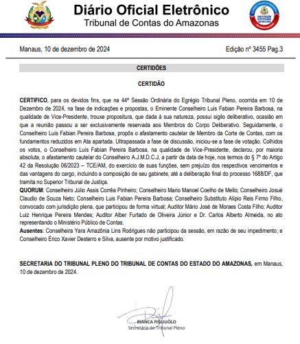 O Tribunal de Contas do Amazonas (TCE-AM) informa que os Membros do Corpo Deliberativo decidiram, por maioria de votos, afastar um dos membros da Corte de Contas em processo que tramita sob sigilo. Mais detalhes podem ser consultados na Certidão publicada nesta terça-feira (10) no Diário Oficial do TCE-AM.