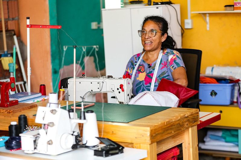 Em março, a costureira descobriu o programa Crédito Rosa acessando a internet. Enquanto confecciona uma nova encomenda, Naby Rodrigues conta como o processo de liberação de crédito foi rápido. Com o dinheiro, ela conseguiu comprar uma máquina de costura industrial, capaz de atender à alta demanda dela, atualmente.
