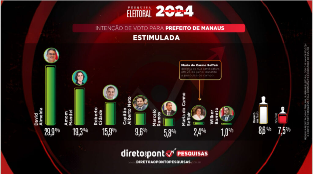 Quarta pesquisa de intenção de votos, divulgada nesta quarta-feira, 31, pelo Instituto Direto ao Ponto Pesquisas, mostra David Almeida (Avante) em primeiro e Amom Mandel (Cidadania) e Roberto Cidade (União Brasil) em uma disputa acirrada pela segunda colocação na corrida pela Prefeitura de Manaus.