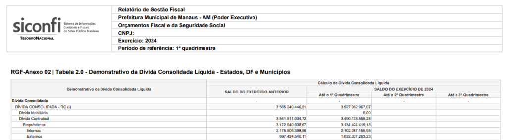 A dívida contratual da Prefeitura de Manaus apresentou aumento de 55%, entre 2020 e 2024, passando de R$ 2,283 bilhões para R$ 3,541 bilhões, um acréscimo de R$ 1,257 bilhão. Os dados constam nos demonstrativo de dívidas consolidadas líquidas, que fazem parte dos relatórios de gestão fiscal apresentados pelo Executivo Municipal, ao Tesouro Nacional.