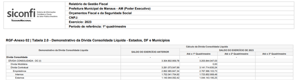Do primeiro quadrimestre de 2023 para o mesmo período deste ano, os relatórios de gestão fiscal apontam um aumento na dívida contratual de R$ 260,43 milhões, passando de R$ 3,281 bilhões para R$3,541 bilhões.