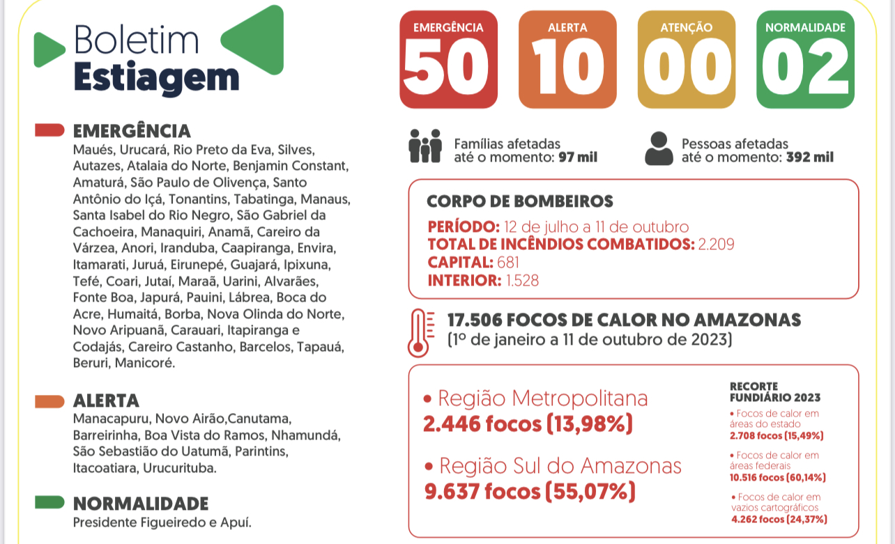 O Governo do Amazonas, por meio do Comitê de Intersetorial de Enfrentamento à Situação de Emergência Ambiental, divulgou o boletim com informações atualizadas sobre a estiagem no estado, nesta quinta-feira (12/10).