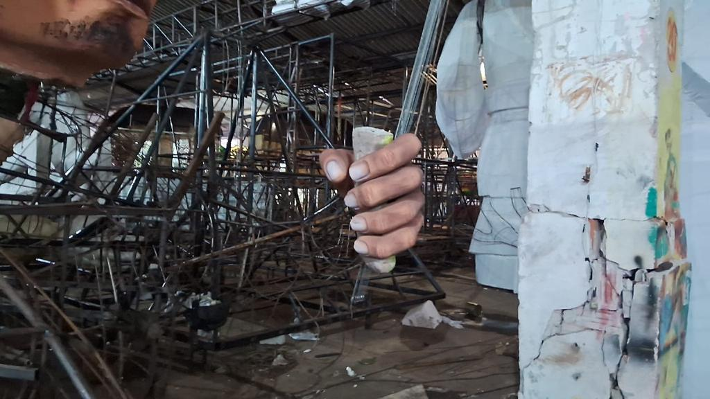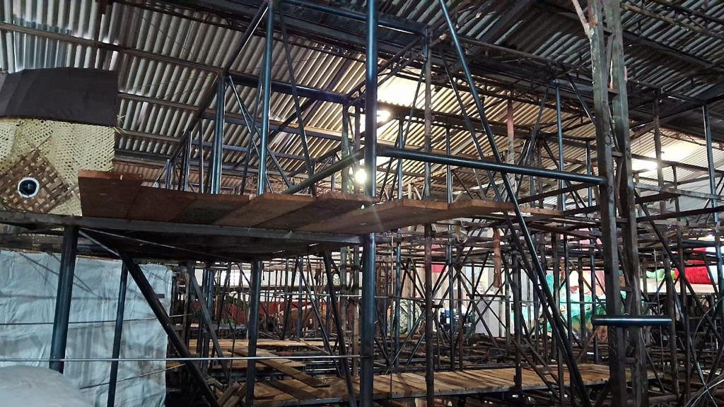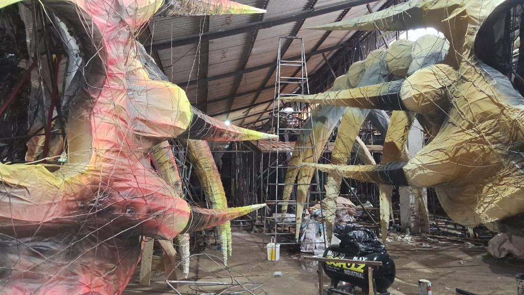 As alegorias são de responsabilidade da Comissão de Artes do Bumbá. O projeto 2023 “Garantido por toda vida” tem como responsáveis Allan Rodrigues, Adan Rene, Djanne Senna, Pablo De Souza e Eneas Dias. As fotos foram tiradas no último fim de semana e mostram apenas partes de poucas peças desmontadas e muito ferro que seria usado na estrutura metálica durante a produção.
