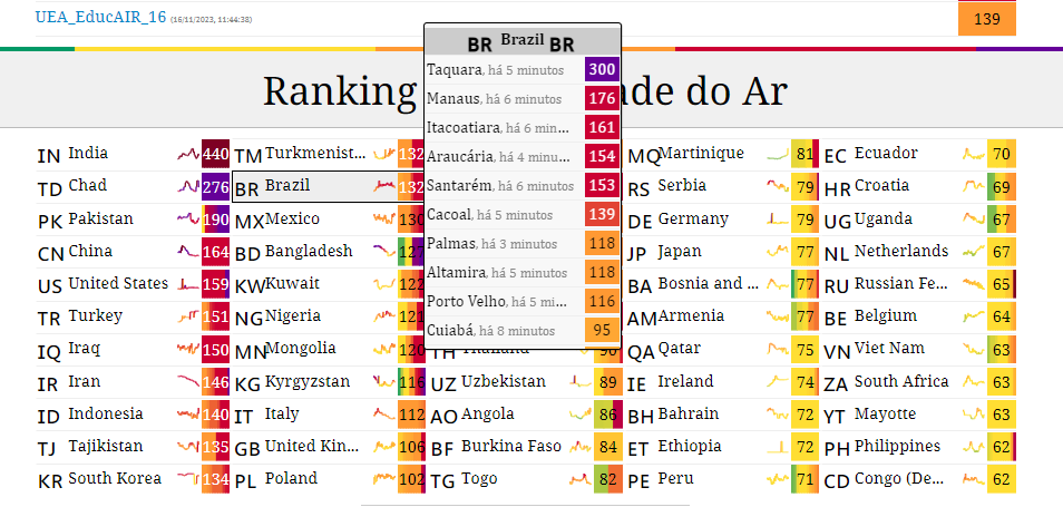 Manaus voltou a ser encoberta por fumaça derivada de queimadas florestais, nesta quinta-feira, 16, e a qualidade do ar já é segunda pior do País, segundo o ranking estabelecido pela organização global aqicn.org . De acordo com a plataforma, que avalia a poluição do ar em mais de 100 países, a capital Manauara apresenta um índice de 178, considerada ‘não saudável e insalubre’, dentro da classificação utilizada.