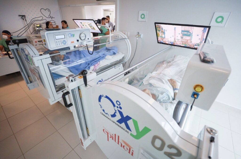 A Oxigenoterapia Hiperbárica consiste na inalação de oxigênio puro em ambiente pressurizado, com pressão superior à atmosférica. Nessas condições, ocorre um aumento significativo da quantidade de oxigênio no sangue, permitindo maior alcance aos tecidos com circulação comprometida. Desde fevereiro, mais de mil procedimentos já foram realizados no Hospital Delphina Aziz.