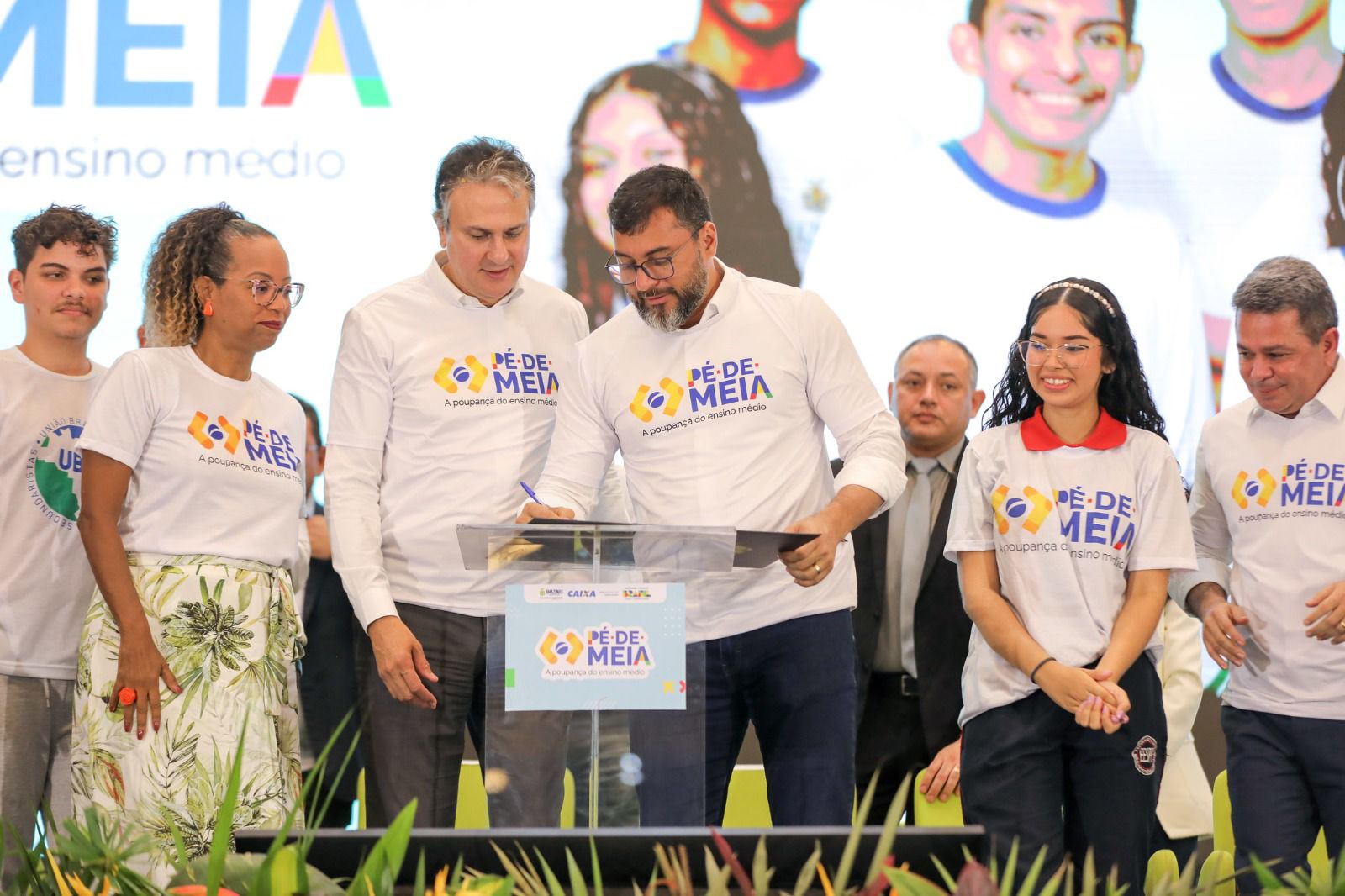 O governador Wilson Lima e o ministro da Educação, Camilo Santana, lançaram no Amazonas, nesta quarta-feira (27/03), o Programa Federal Pé-de-Meia, que deve beneficiar até 105 mil estudantes do ensino médio no Amazonas, sendo 74,6 mil apenas da rede estadual. A iniciativa é um incentivo financeiro, na modalidade de poupança, para promover a permanência e a conclusão escolar de estudantes matriculados no Ensino Médio público.