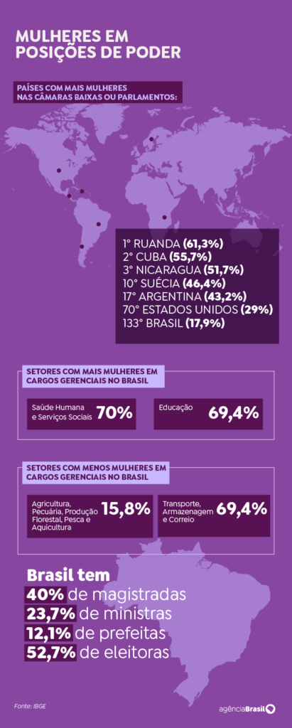 As mulheres são maioria entre os estudantes que estão em vias de concluir o ensino superior, no entanto são minoria em relação a posições de poder. Dados divulgados nesta sexta-feira (8) pelo Instituto Brasileiro de Geografia e Estatística (IBGE) mostram, por exemplo, que apenas 39,3% dos cargos gerenciais no país são ocupados por mulheres.