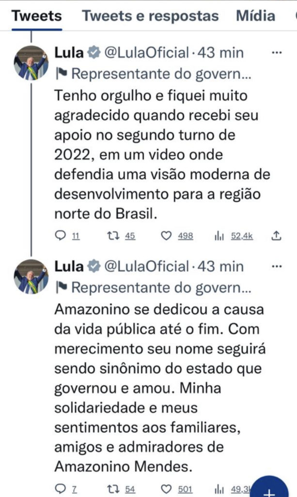 Lula disse que Amazonino se dedicou à causa da vida pública até o fim. “Com merecimento, seu nome seguirá sendo sinônimo do Estado que governou e amou. Minha solidariedade e meus sentimentos aos familiares, amigos e admiradores Amazonino Mendes”.