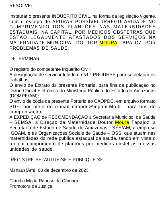 O inquérito, assinado pela promotora de Justiça, Cláudia Raposo, tem como objetivo apurar possíveis irregularidades no cumprimento de plantões em maternidades estaduais por obstetras que estão legalmente afastados das atividades na Maternidade Municipal Doutor Moura Tapajós por razões de saúde.