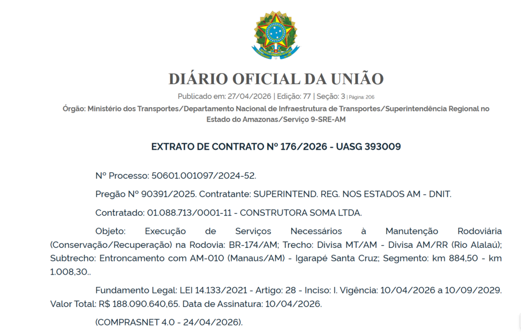 O Ministério dos Transportes firmou contrato de R$ 188,09 milhões com a construtora Soma LTDA. para serviços de manutenção na BR-174, principal ligação terrestre entre Amazonas e Roraima. O extrato foi publicado no Diário Oficial da União (DOU) desta segunda-feira (27). As obras estão previstas para ocorrer entre abril de 2026 e setembro de 2029.