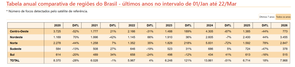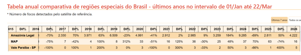Cinco estados da Amazônia Legal apresentaram aumento percentual nas ocorrências, em 2026: Amapá (900%), Pará (167%), Maranhão (94%), Roraima (65%) e Tocantins (1%). Apesar de o maior aumento percentual ter ocorrido no Amapá, os estados do Pará e Roraima foram os que obtiveram os maiores volumes de focos de fogo: cerca de 1,3 mil e 1,1 mil, respectivamente. Em terceiro vem o Maranhão, com pouco mais de 1,1 mil registros.