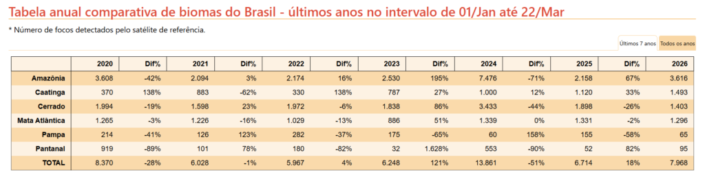 O volume de queimadas disparou na Amazônia durante o período chamado de inverno amazônico, cujo pico ocorre entre fevereiro e abril, com a intensificação das chuvas na região. Segundo o Instituto Nacional de Pesquisas Espaciais (INPE), vinculado ao Ministério de Ciência Tecnologia e Inovação, entre 1 de janeiro e 22 de março deste ano, houve um aumento de 67% no volume de focos de incêndios no comparativo com o mesmo período de 2025. Na prática, o bioma, considerado um dos mais importantes do mundo, registrou 3,6 mil ocorrências em 2026 contra 2.158 no ano anterior.