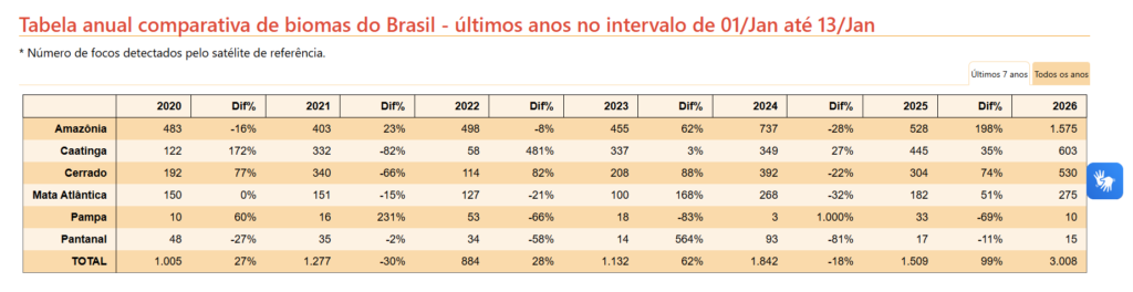 Foi o maior aumento entre os sete biomas brasileiros monitorados pelo INPE, através de imagens via satélite. Além da Amazônia, outros quatro biomas tiveram aumento no volume de focos de calos. Pampa e Pantanal recuaram no comparativo com 2025. Veja os números na imagem abaixo, extraída do site do INPE.