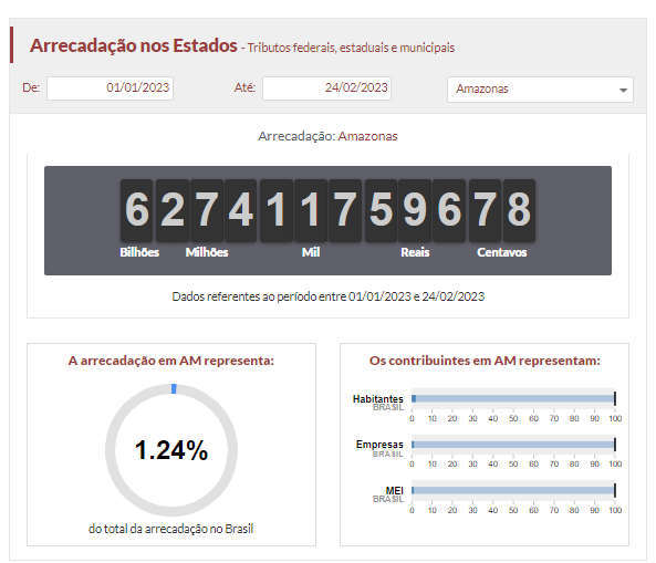 Os estados da Amazônia Legal arrecadaram, juntos, cerca de R$ 32,4 bilhões em impostos, entre 1 de janeiro e 24 de fevereiro, mostra prévia do Impostômetro, ferramenta que reúne projeções de receitas de tributos de estados, capitais e do Brasil. O Pará foi o que obteve o melhor desempenho do grupo, acumulando R$ 7,75 bilhões. Roraima registrou a menor arrecadação: R$ 642,4 milhões. O Amazonas ficou em terceiro, com R$ 6,27 bilhões.