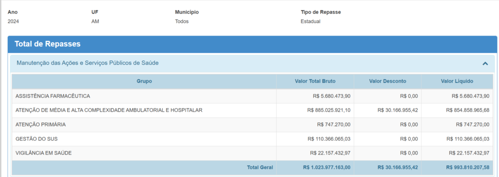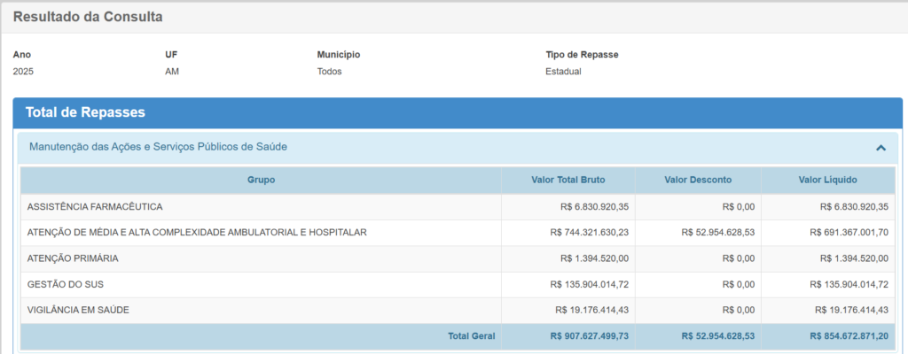 Estão incluídos na manutenção das ações e serviços áreas como assistência farmacêutica, cuja parcela de repasses no último exercício somou R$ 6,8 milhões; atenção primária; gestão do SUS, com repasses que somaram R$ 135,9 milhões; vigilância em saúde, com R$ 19,1 milhões; além da atenção de média e alta complexidade. Veja os valores líquidos repassados a cada área da saúde em 2024 e 2025 nas tabelas extraídas do descritivo do FNS: