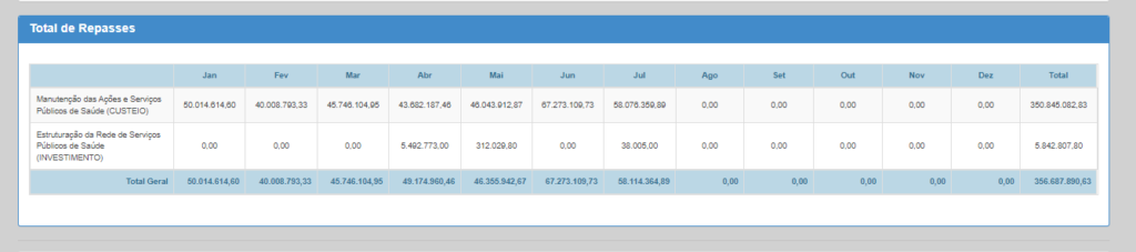 A maior parte do valor bruto transferido em 2023, foi para custeio, como manutenção de ações e serviços públicos de saúde. Foram R$ 350,84 milhões através da modalidade. Os R$ 5,84 milhões restantes foram a título de investimento, para a estruturação da rede de serviços públicos de saúde.