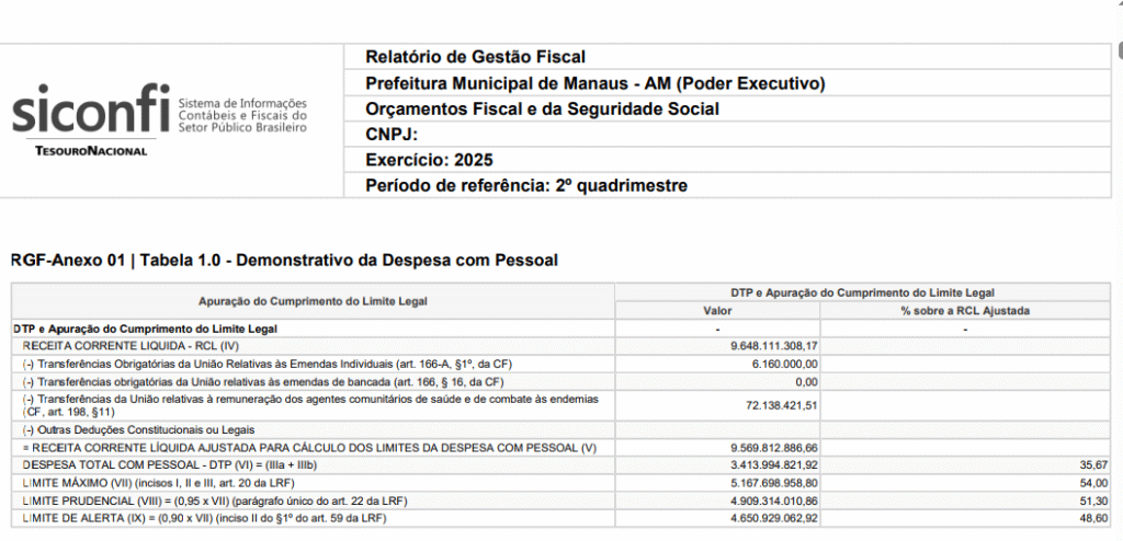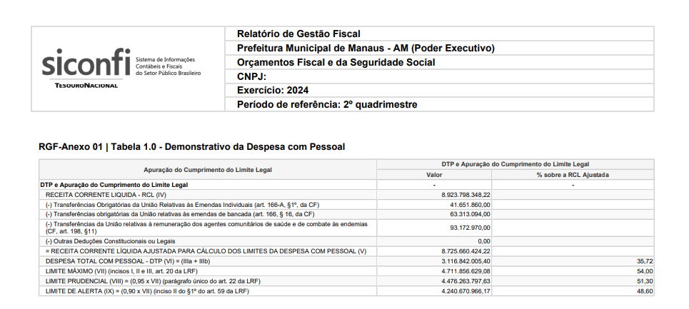 Apesar do aumento, os dados indicam que a Prefeitura de Manaus permanece abaixo dos limites estabelecidos pela Lei de Responsabilidade Fiscal. Para municípios de grande porte, como Manaus, a LRF define três faixas de comprometimento da RCLA com despesa de pessoal: limite de alerta (até 48,60%), limite prudencial (até 51,30%) e limite máximo (54%). Atingir ou ultrapassar essas faixas pode acarretar sanções fiscais e restrições legais à administração municipal.