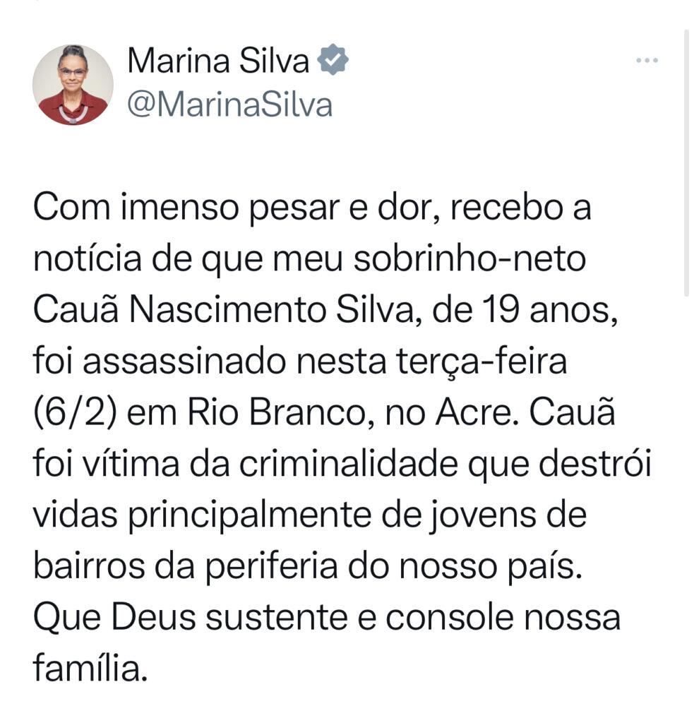 “Com imenso pesar e dor, recebo a notícia de que meu sobrinho-neto Cauã Nascimento Silva, de 19 anos, foi assassinado nesta terça-feira (6/2) em Rio Branco, no Acre. Cauã foi vítima da criminalidade que destrói vidas principalmente de jovens de bairros da periferia do nosso país. Que Deus sustente e console nossa família.”