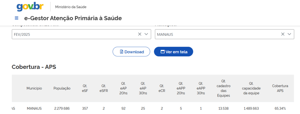 Já a capacidade das equipes da estratégia saúde da família, para Manaus, é de 1.489.663 pessoas, deixando de fora 790 mil habitantes. A população considerada pelo e-gestor, que reúne as informações da Atenção Primária, é de 2.279.686 habitantes para a capital amazonense – dado do IBGE (Instituto Brasileiro de Geografia e Estatística).