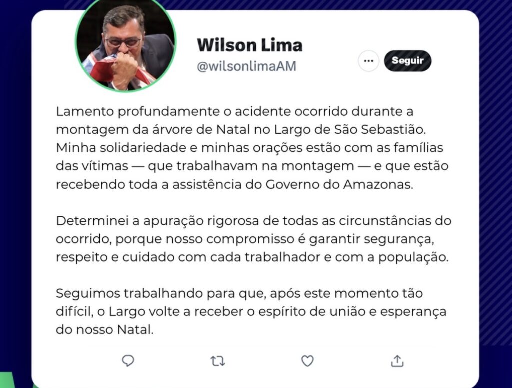 O governador do Amazonas, Wilson Lima, usou seu perfil em uma rede social para lamentar o ocorrido e prestar solidariedade às famílias das vítimas.