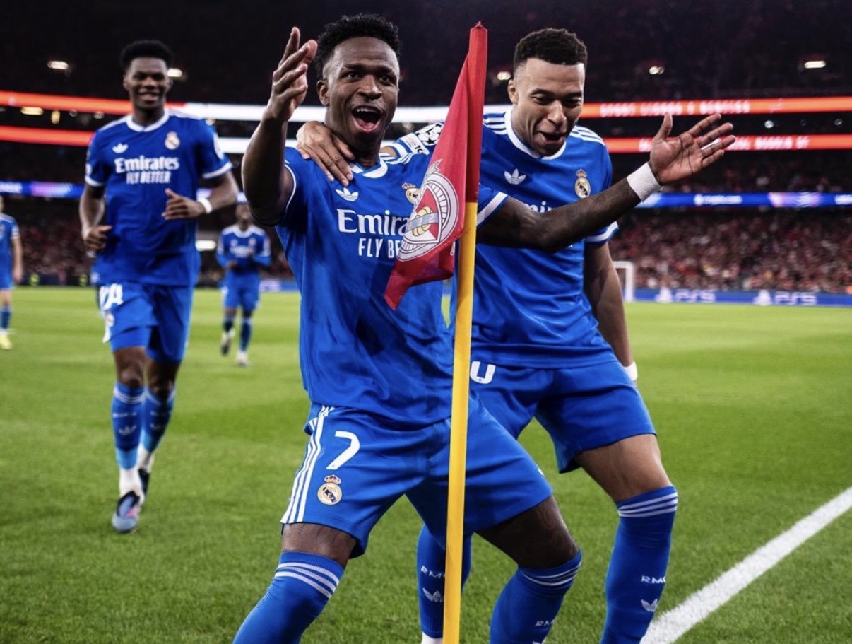 Aos quatro minutos do segundo tempo, Vini Jr recebeu do atacante Kylian Mbappé na esquerda e bateu da entrada da área. A bola fez um arco e acertou o ângulo do goleiro Anatoliy Trubin. O camisa 7 do Real Madrid festejou dançando em frente à bandeira de escanteio, próximo a torcedores do Benfica.